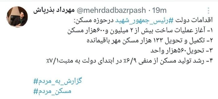 وزیر راه و شهرسازی در یکی از شبکههای اجتماعی به رشد تولید مسکن از منفی ۶.۹ درصد در ابتدای دولت سیزدهم به ۷.۱ درصد، به عنوان یکی از مهمترین دستاوردهای این دولت یاد کرد.