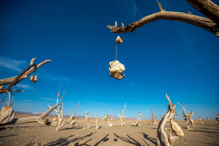 برای آویزان کردن سنگ، درویش خان چاله هایی در زمین خشک حفر کرده است، سپس درختان خشکیده را در این چاله ها کاشته و بعد از اتمام کاشت شروع به آویزان کردن سنگ هایی از شاخه های درختان کرده است. در نهایت در باغ ۱۰۰۰ متری، ۱۸۰ درخت با سنگ هایی به جای میوه وجود دارد که حس غریب و هولناکی به این باغ داده است، اما خود درویش خان از این کار احساس رضایت و خشنودی می کرد. البته به جز سنگ، چیزهای دیگری مانند لاستیک های پنچر شده، آینه های شکسته، فنر و هر چیز دیگری که به نظر می رسد از درختان آویزان کرده است.