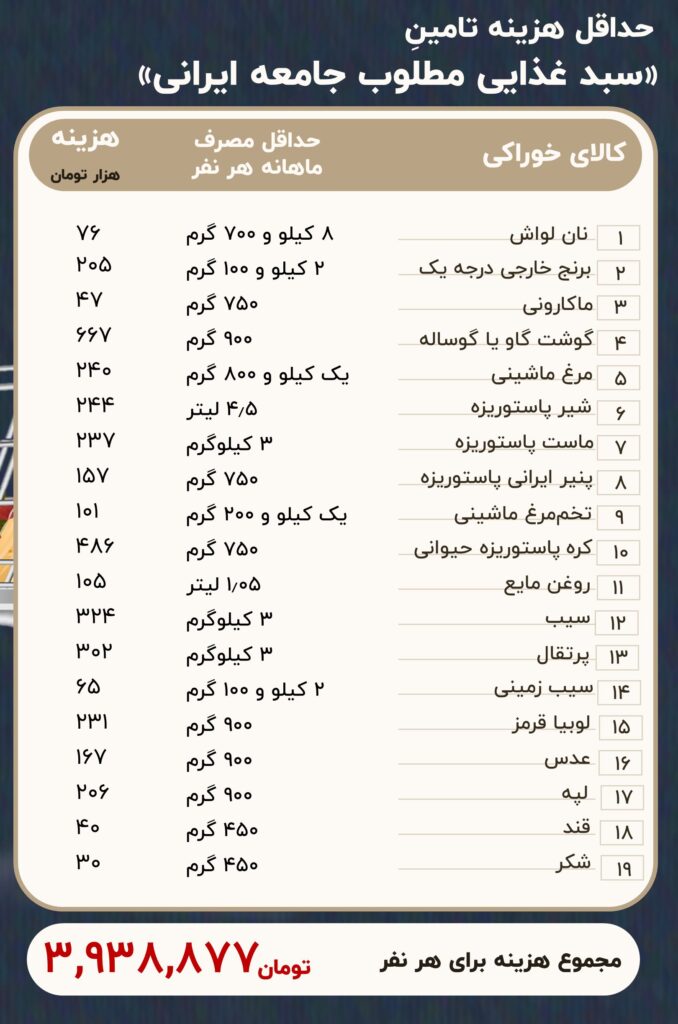 با توجه به مقادیری که گفته شد، هر فرد در شهریور 1404 برای تهیه این سبد خوراکی باید 3 میلیون و 938 هزار و 887 تومان هزینه کند.