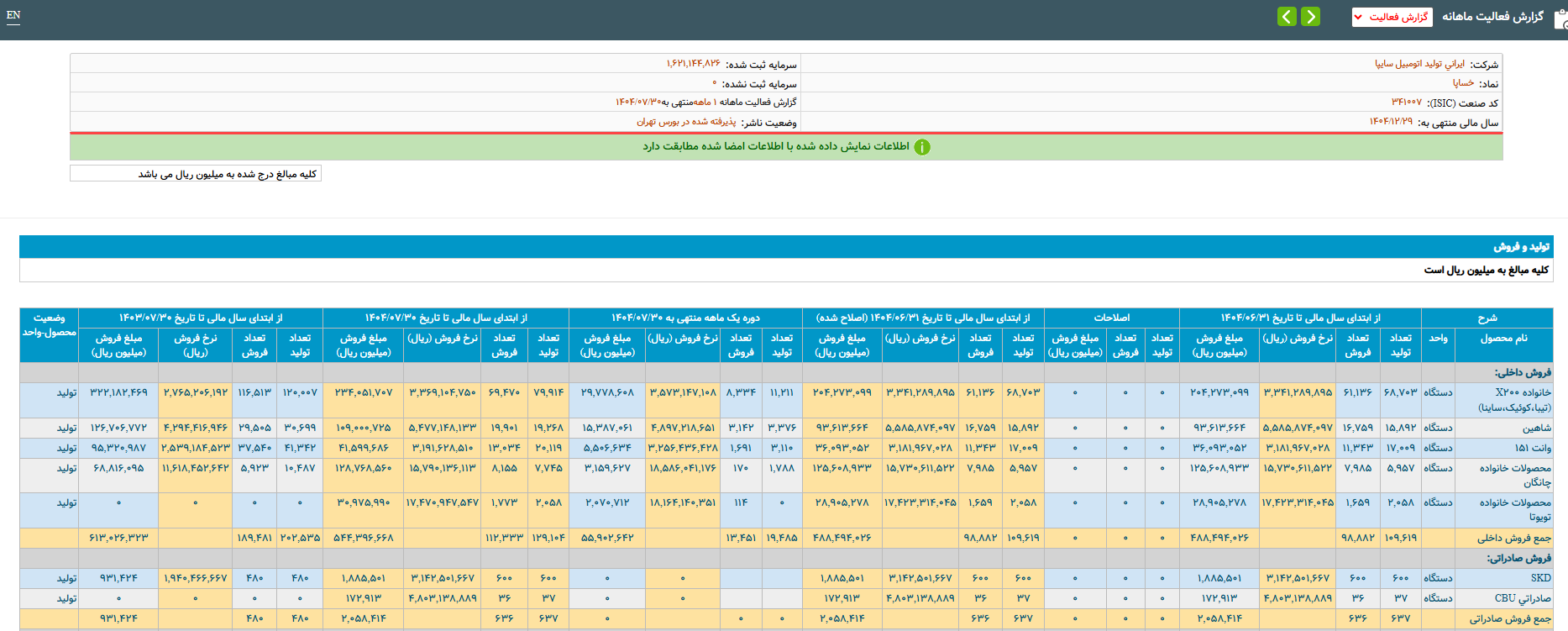 بررسی وضعیت این شرکت خودرویی در سامانه کدال نشان می دهد که در هفت ماه امسال گروه X ۲۰۰ (تیبا، کوئیک، ساینا) ۷۹ هزار و ۹۱۴ دستگاه، خودروی شاهین ۱۹هزار و ۲۶۸ دستگاه، چانگان هفت هزار و ۷۴۵ دستگاه و محصولات خانواده تویوتا ۲ هزار و ۵۸ دستگاه تولید شده است.