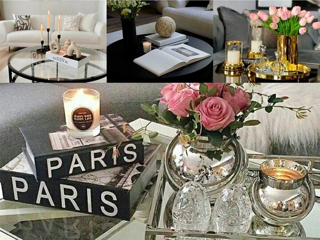 از گلدانهای دکوری شیشهای با چند شاخه گل مصنوعی استفاده کنید. یک سینی گرد یا مربعی روی میز قرار دهید و درونش وسایل دکوری مثل شمع، گل، یا کتابها بچینید.