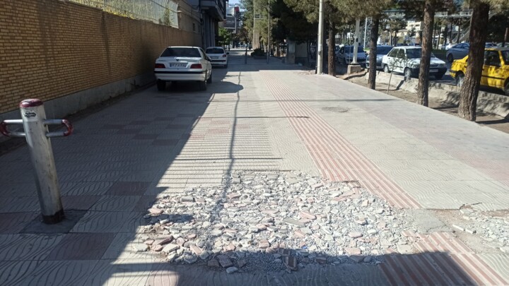 ۴. حذف موانع: حذف کامل موانع عمودی و افقی ناگهانی نظیر پایههای نامناسب یا تابلوهایی که در محدوده عرض پیادهرو قرار دارند.