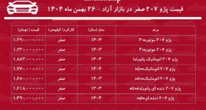 قیمت پژو ۲۰۷ موتور TU۳ نسبت به روز گذشته ۲۷ میلیون تومان عقبنشینی کرد و در محدوده یک میلیارد و ۲۹۰ میلیون تومان قرار گرفت.